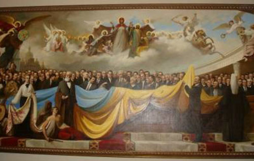 За офіційною версією, 23 серпня 1991 року, після провалу путчу в Москві, група народних депутатів внесла синьо-жовтий український прапор у сесійний зал Верховної Ради. Освячення Національного прапора було проведено священиком УАПЦ Петром Бойком. Якраз до цієї події написана відповідна картина на стіні ВРУ, а прапор, як реліквія, урочисто зберігається під склом в музеї ВРУ.